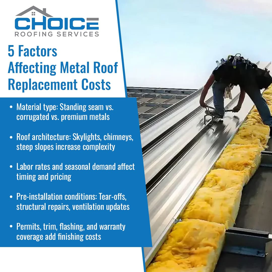 The skill level of the roof replacement contractor and the timing of the installation both influence total project costs. Hiring a roofing specialist with local expertise in metal systems helps reduce long-term risks.